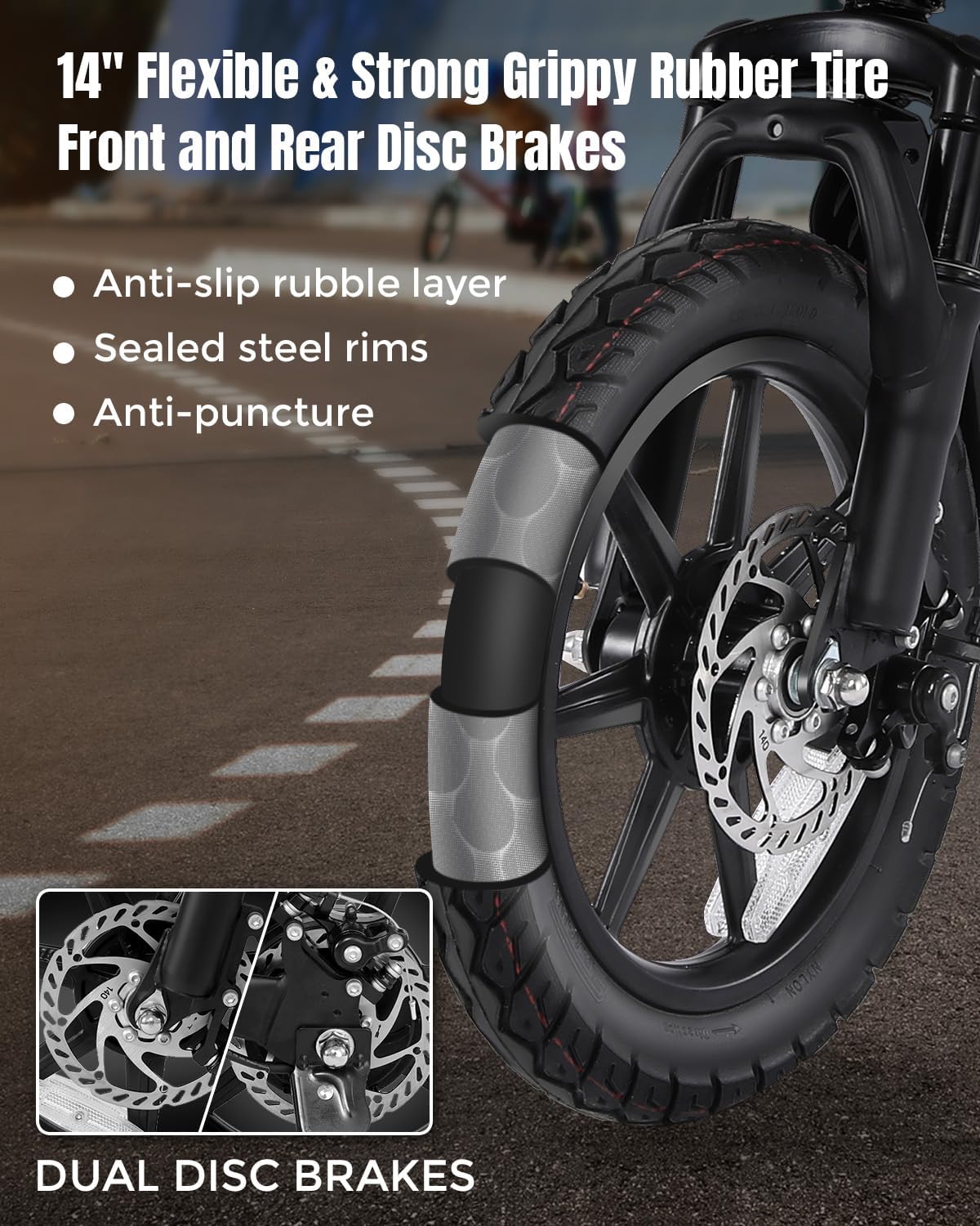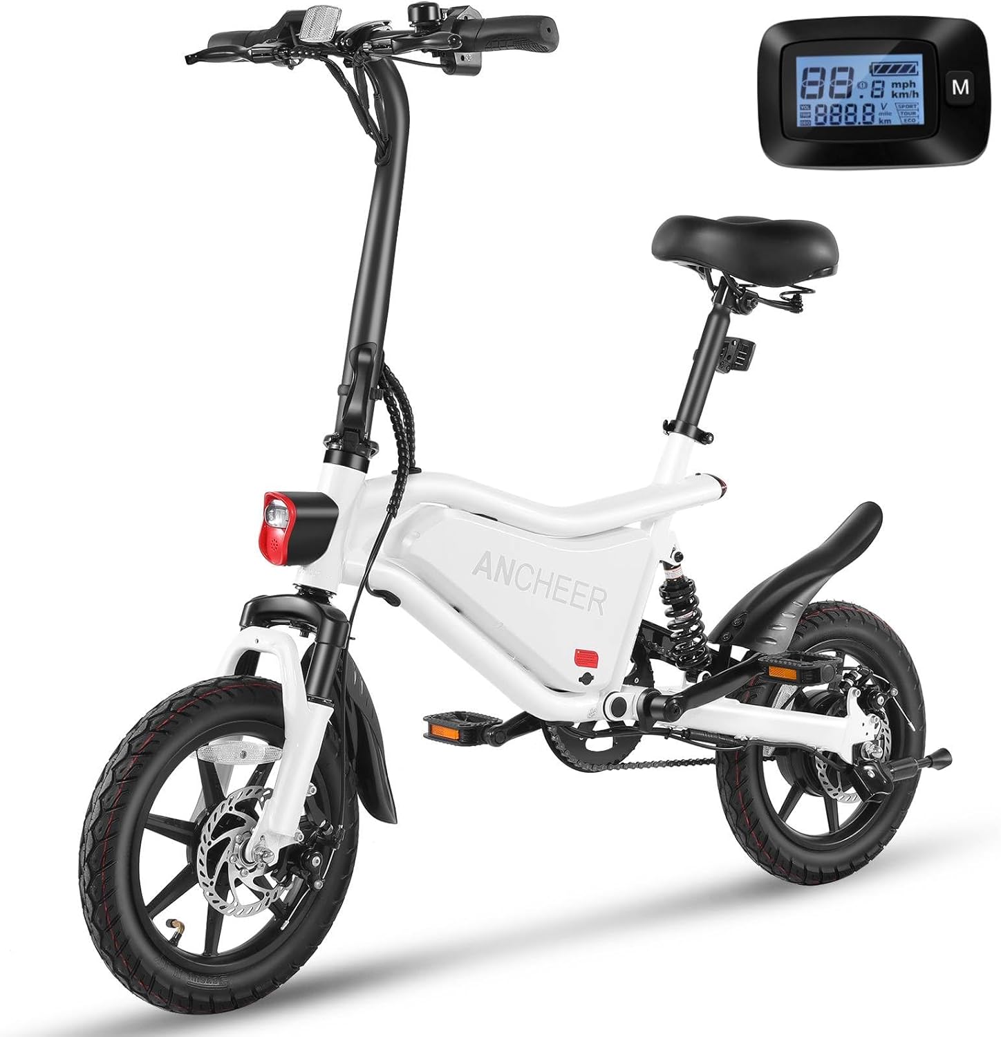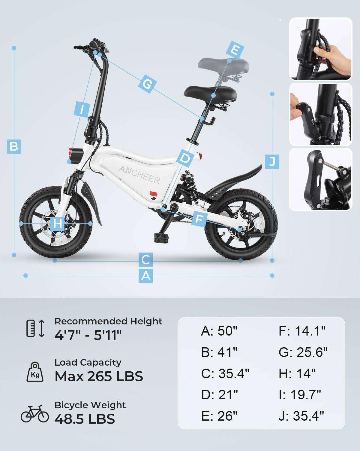 🚗[Foldable & Lightweight User Friendly] With mini 50*21*42inch size, 48.5lbs weight, Ancheer 14” Folding Electric Bike is space saving and easily carried in car trunks. Max load: 265lbs/120kg, recommended height range: 4’6”-5’6”. Ideal for adults and teens for convenient rides around neighborhoods, cities, campuses, campgrounds, and beaches for short trips or grocery shopping, etc.!