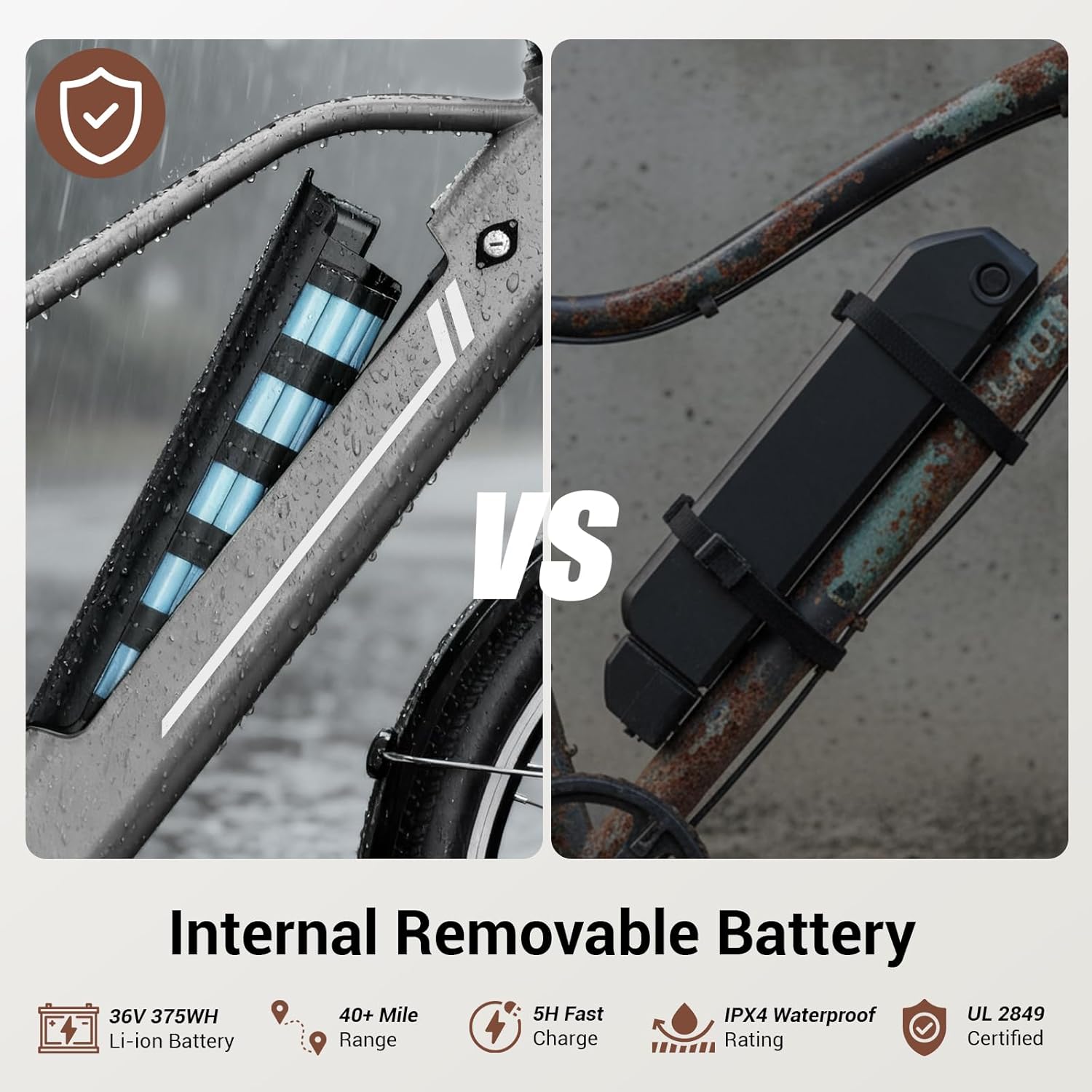 【36V EBIKE REMOVABLE BATTERY】Powered by a large-capacity lithium-ion battery, this e-bike provides up to 40 miles of range in assist mode(*Range may vary depending on rider weight, terrain, and assist level). The battery is easily removable for safe indoor charging in just 5-6 hours, eliminating the need for an outdoor outlet—making it the ultimate choice for apartment dwellers, commuters, and anyone who values security and effortless charging.