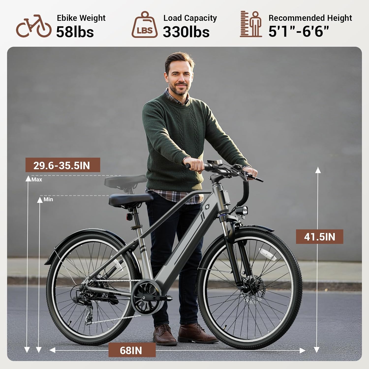 Yoloway Electric Bike is equipped with a 750W brushless motor, providing smooth and powerful acceleration performance, with a maximum speed of 22 MPH. Whether on city streets or rugged trails, the dual disc brake system can provide fast and reliable braking effect, enhancing riding safety, and the front suspension effectively reduces vibration and improves comfort. The adult e-bike is equipped with a 480WH removable IPX4 waterproof lithium battery. In pedal assist mode, this ebike can travel up to 50+ miles, and when using the throttle, this electric commuting bicycle for adults can travel 30 miles, fully meeting the needs of long-distance riding. The 27.5-inch large tires provide excellent traction and stability, conquering terrains such as City road, Soil, Travel, Snow, etc., and the 7-speed transmission system of the electric bike for adults allows you to easily shift gears under different road conditions. The smart LCD display shows information such as speed, mileage and battery status in real time, so you can keep track of riding information at any time. The electric mountain bike four riding modes, including Pedal Assist, Pedal-Only, Throttle, and Walking Assist Modes, which can flexibly adapt to different riding needs.Bright headlights and reflectors can illuminate the road ahead when riding at night, significantly improving the safety of night riding.The e bikes for adults electric’s adjustable seat and handlebar design fits riders from 5’3″ to 6’5″ tall and weighing up to 264 lbs. 85% pre-assembled design, combined with detailed installation guide and video, ensures easy assembly and a personalized, comfortable riding experience.