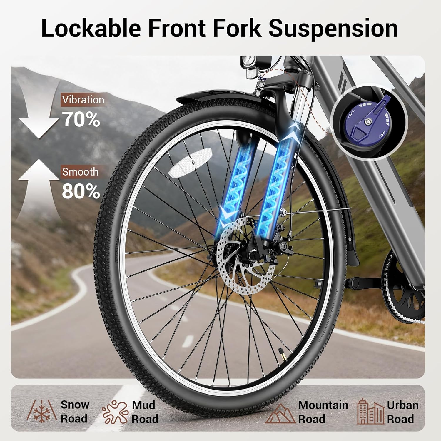 【MOUNTAIN BIKE WITH FRONT SUSPENSION】The 26 inch electric mountain bike is designed to handle a variety of terrains. It features large, puncture-resistant tires for traction, front and rear disc brakes for effective braking, and a suspension fork that effectively adapts to bumps, potholes, and uneven terrain, ensuring a comfortable ride even on rough roads.