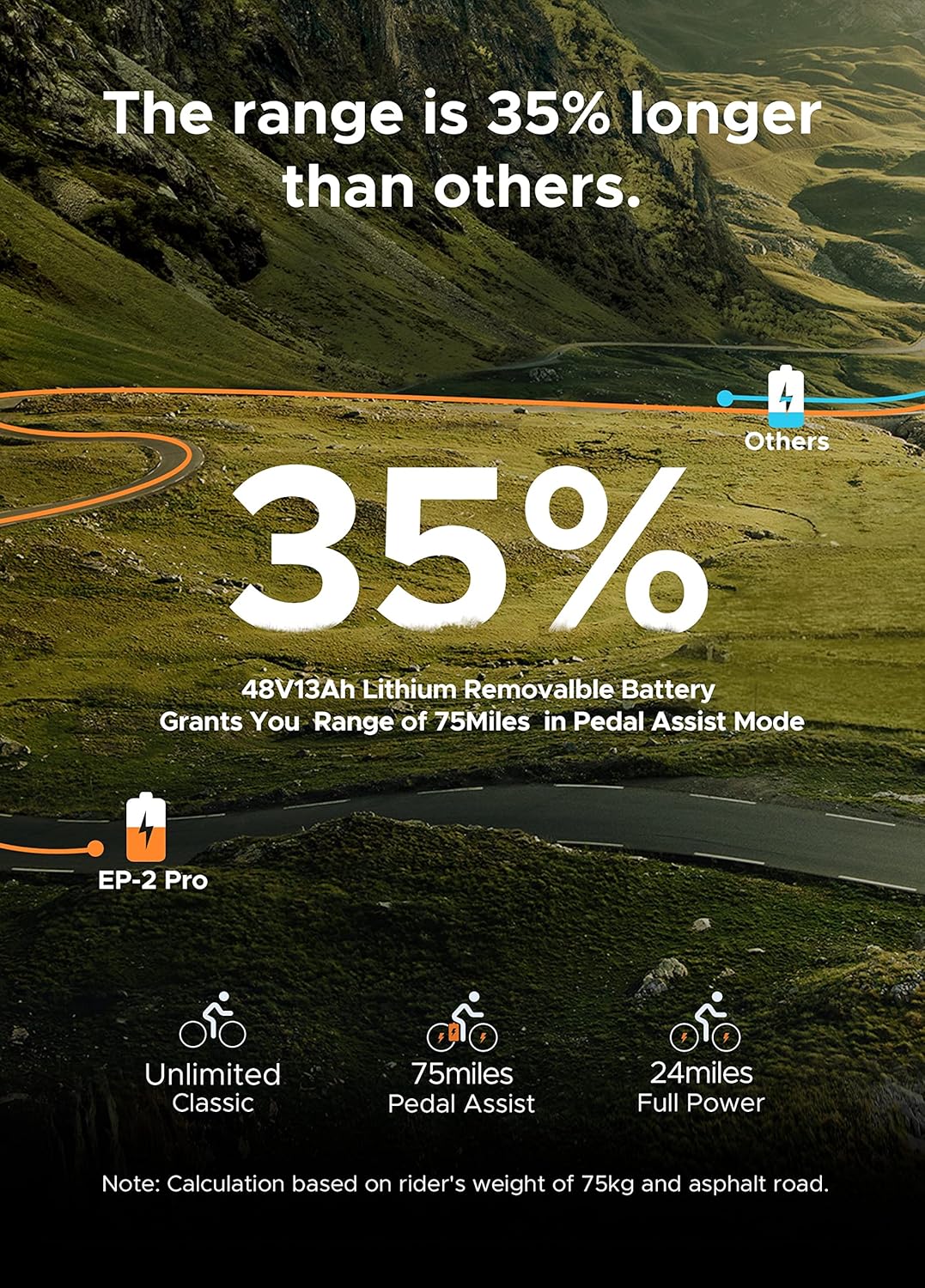 【 Peak 960W Motor and Long Battery Life】 The ENGWE EP-2 PRO electric bike is equipped with a 750W brushless motor that reaches speeds of up to 26mph. The 48V 13Ah lithium battery provides a range of over 75Mile, ensuring long and enjoyable rides.
